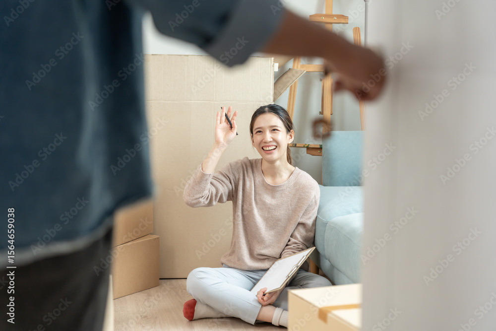Moving house, relocation. Open the door found wife smile and play on new house, inside the room was a cardboard box contain personal belongings and furniture. move in the new apartment or home.
