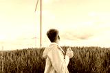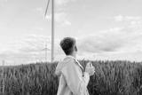 Teenage boy in yellow jacket holding sandwich and standing in front of wind turbines in rural area. Back view. Scene of break during eco project or green energy learning.