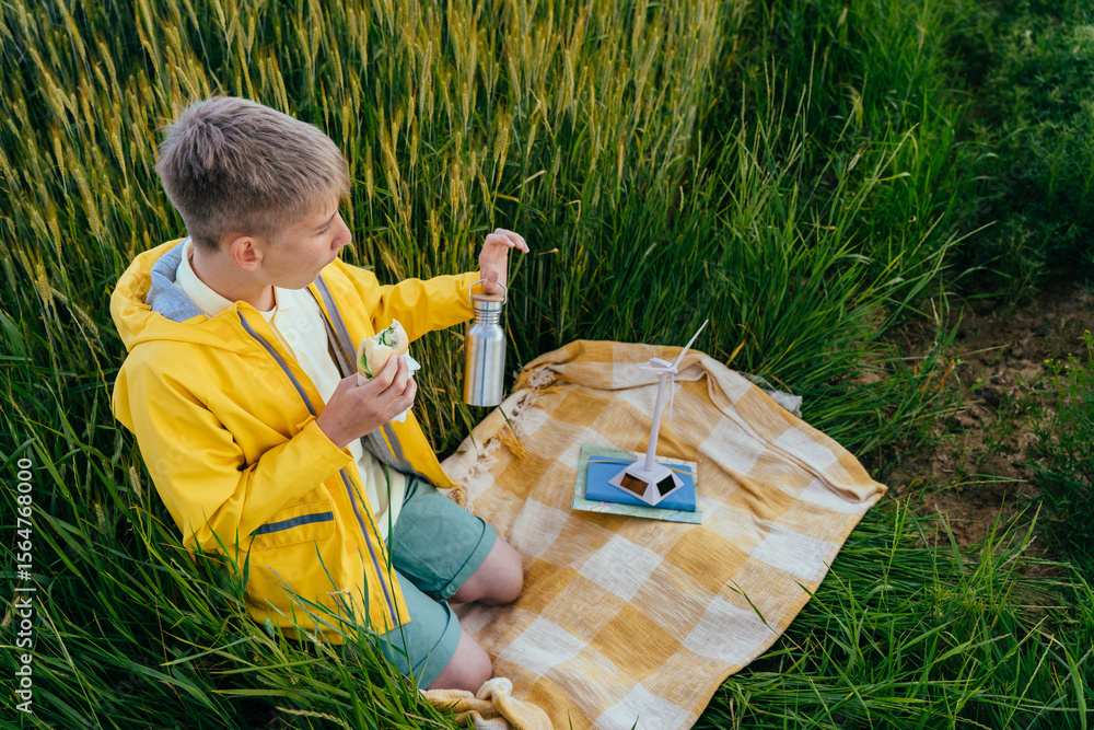 Boy in yellow jacket holding sandwich and opening reusable bottle while sitting on picnic blanket in tall grass. Wind turbine model and notebook on blanket.
