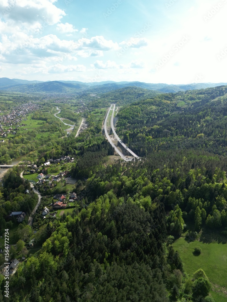 Budowa drogi ekspresowej S1 między Węgierską Górką a Milówką widziana z drona w wiosenny dzień. Construction of the S1 expressway between Węgierska Górka and Milówka captured by drone on a spring day