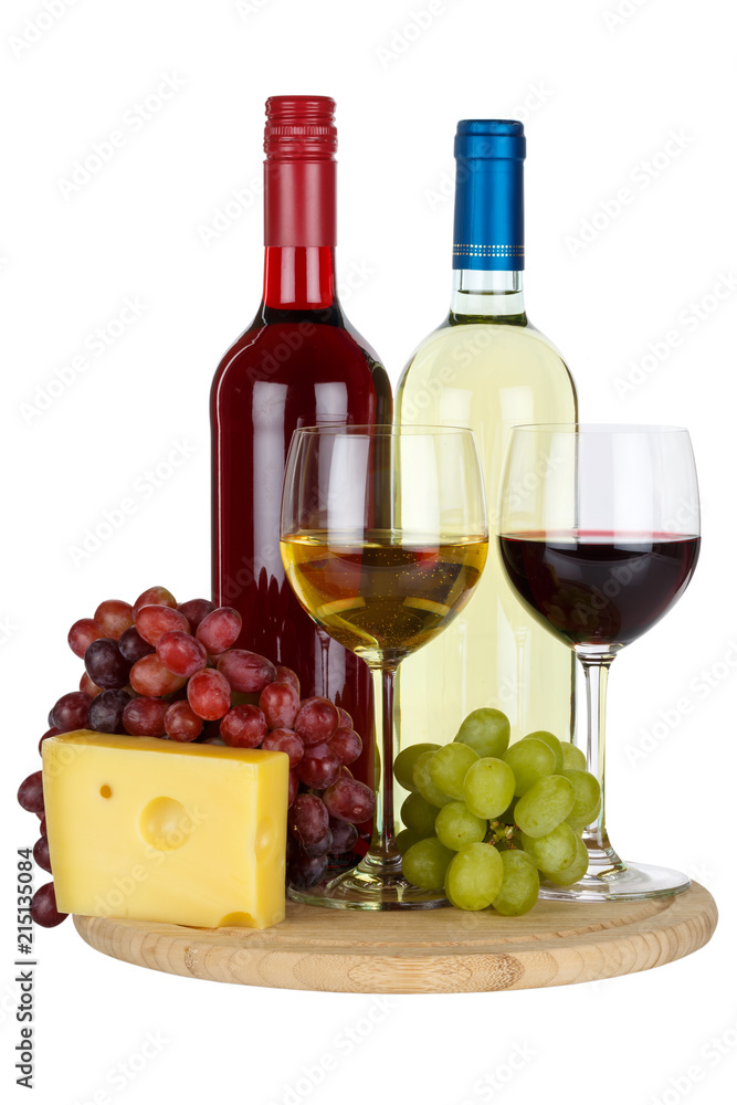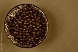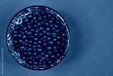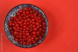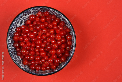 A top-down shot of a decorative blue and white bowl filled with vibrant red currants, placed on a striking red background with ample copy space.