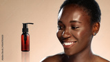 Beautiful woman showcasing skincare product against a neutral background in a natural setting