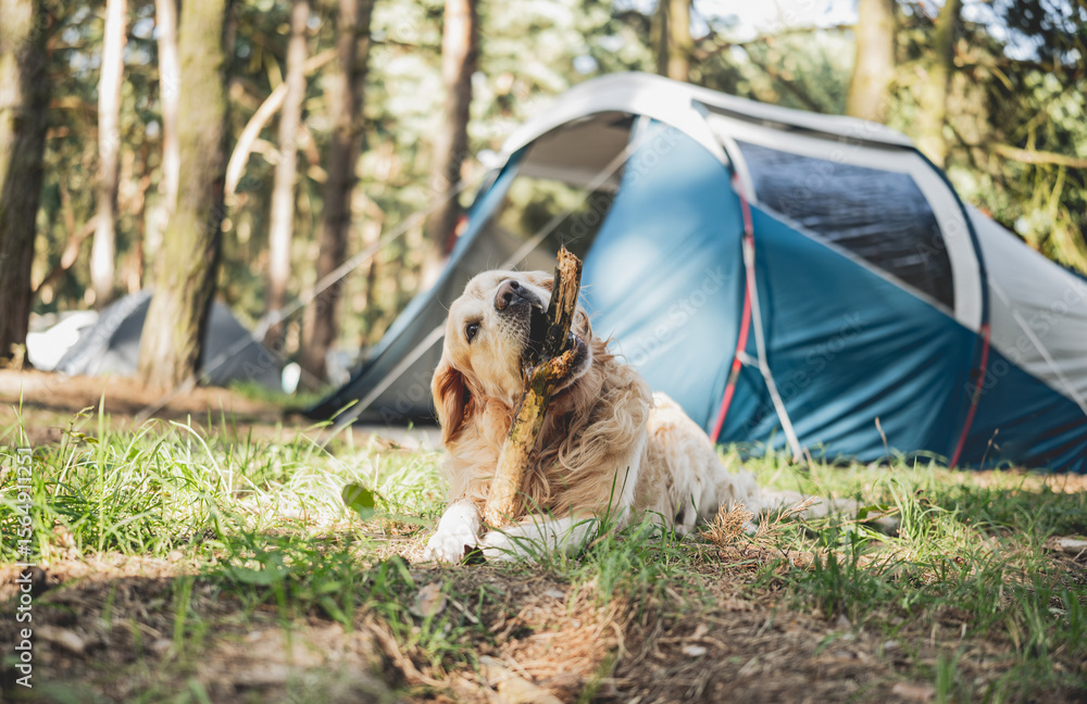 Adorable Golden Retriever Dog Lying By Touristic Camp Tent Playing With A Stick Outdoors