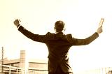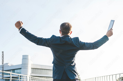 Victorious Businessman with Raised Arms and Tablet Achievement and Success