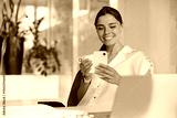In a bright and vibrant office environment, a cheerful woman is looking at her smartphone while enjoying her coffee