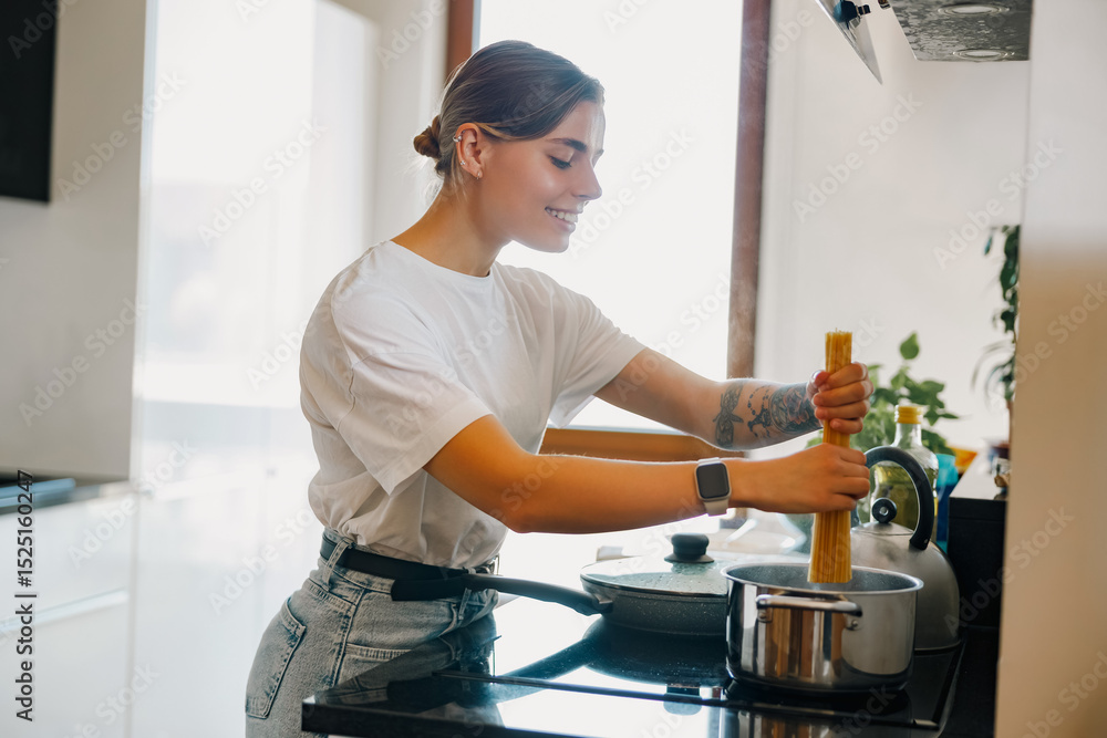 A young woman is comfortably seated in a stylish chair, engaged with a tablet in a modern office environment
