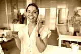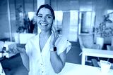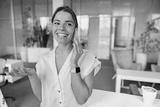 A cheerful young woman is smiling brightly while conversing on the phone in a stylish and modern office environment