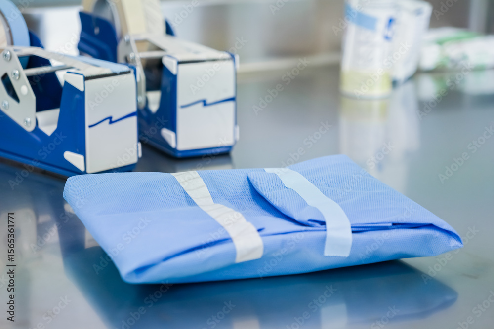 A precisely wrapped blue medical supply package, validated by white indicator tape, prepared and organized for sterile conditions in a hospital or clinic setting