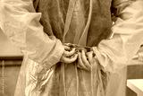 A medical professional's back tying disposable blue apron over a green gown, highlighting crucial infection control and patient safety