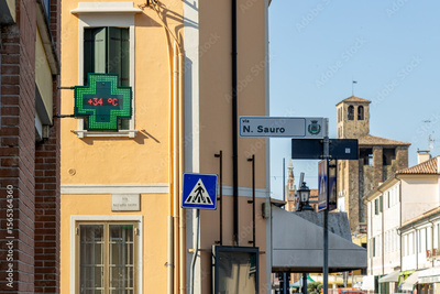 Piove di Sacco, Padua, Veneto, Italy - 4th July, 2025: Street thermometer displaying 34 degrees Celsius in the summer heat on a scorching day