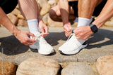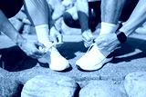 Pair of friends preparing for a morning run by tying shoelaces at a serene outdoor location surrounded by nature's beauty