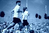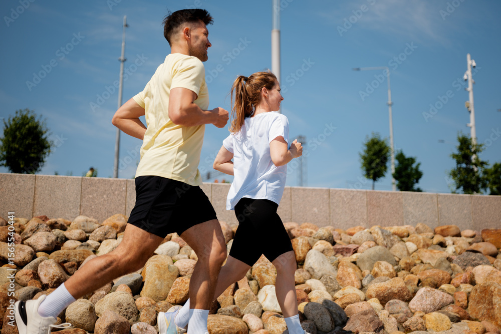 Joyful morning jog through scenic park with vibrant greenery and smooth stones as the backdrop