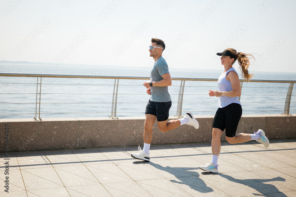 Jogging along the waterfront promenade on a sunny day with friends enjoying outdoor fitness and fresh air