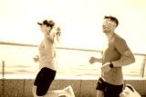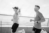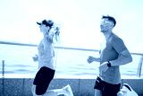 Running by the waterfront on a sunny day, two friends enjoy exercise while taking in the beautiful view along the promenade