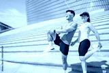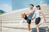 Joyful fitness enthusiasts stretching on modern steps in a vibrant urban setting under bright sunlight during morning workout sessions