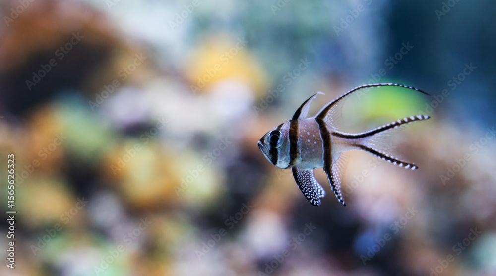 The Banggai cardinalfish, Pterapogon kauderni. Tropical marine aquarium cardinalfish in the family Apogonidae. Macro view, shallow depth of field, selective focus.