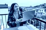 Young frustrated woman working remotely on laptop, squinting from weak signal and sunlight glare on screen