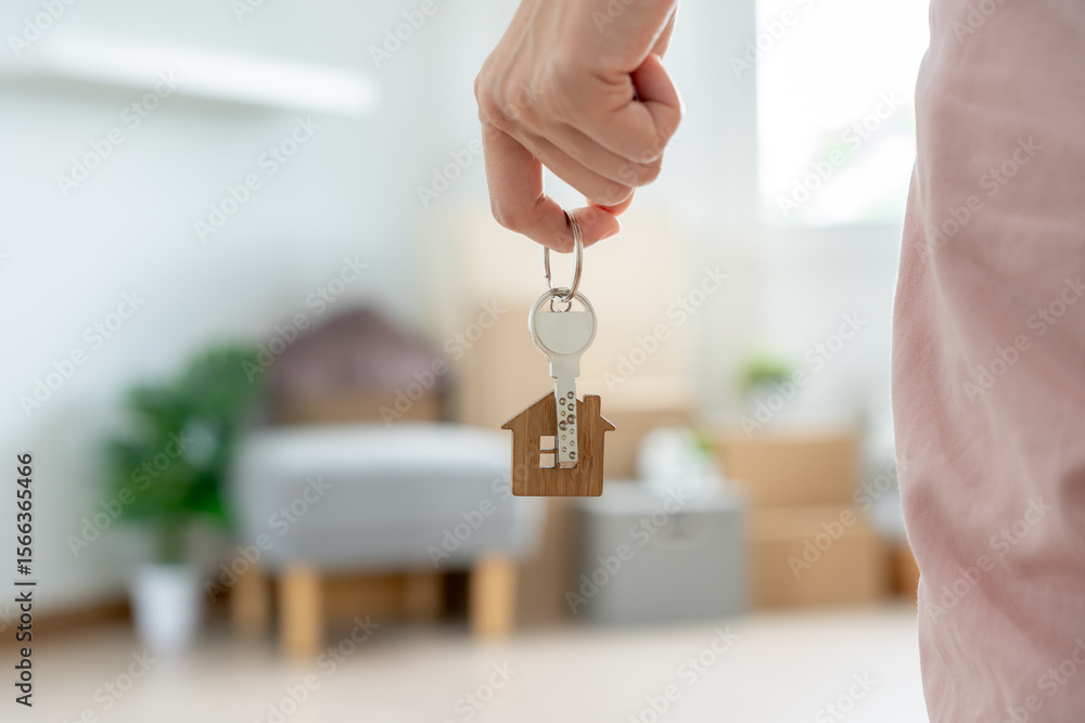 Moving house, relocation. Woman hold key house keychain in new apartment. move in new home. Buy or rent real estate. flat tenancy, leasehold property, new landlord, dwelling, loan, mortgage.