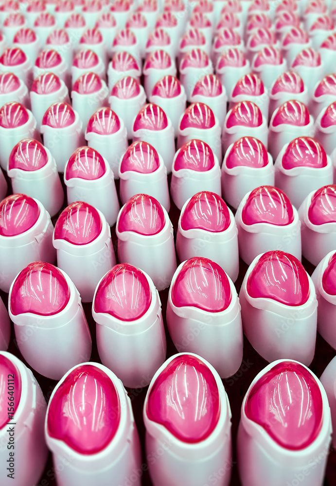 Deodorant, bottles with pink lids in a row.