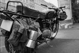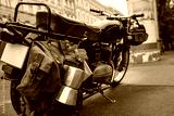Vintage motorcycle parked on street with military style canvas saddlebags camping gear and red seat showing classic design retro travel adventure and urban lifestyle transportation