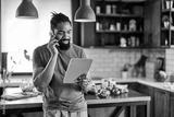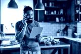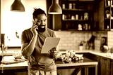 Happy young afro american man having fun preparing food and looking for recipes online using a tablet in kitchen, or a young businessman working from home office making connections online, talking mak