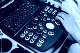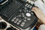 Close-up of ultrasound machine as medical worker performs scan. Concept medical imaging and diagnostic technology