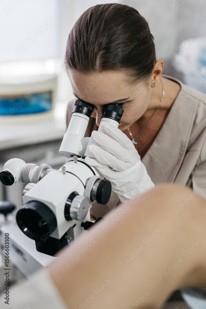 Gynecologist examines cervix using a colposcope for detailed inspection. Concept precise diagnostics and women’s health