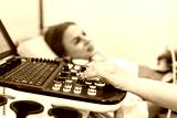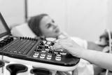 Medical worker performing ultrasound scan on pregnant woman in clinic. Concept: prenatal diagnostics and maternal care