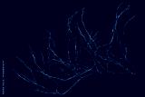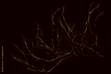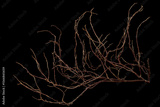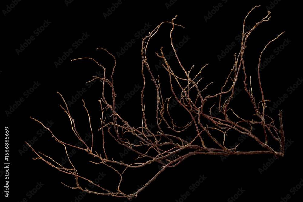 The intricately entwined withered branch of a bush on a black background.