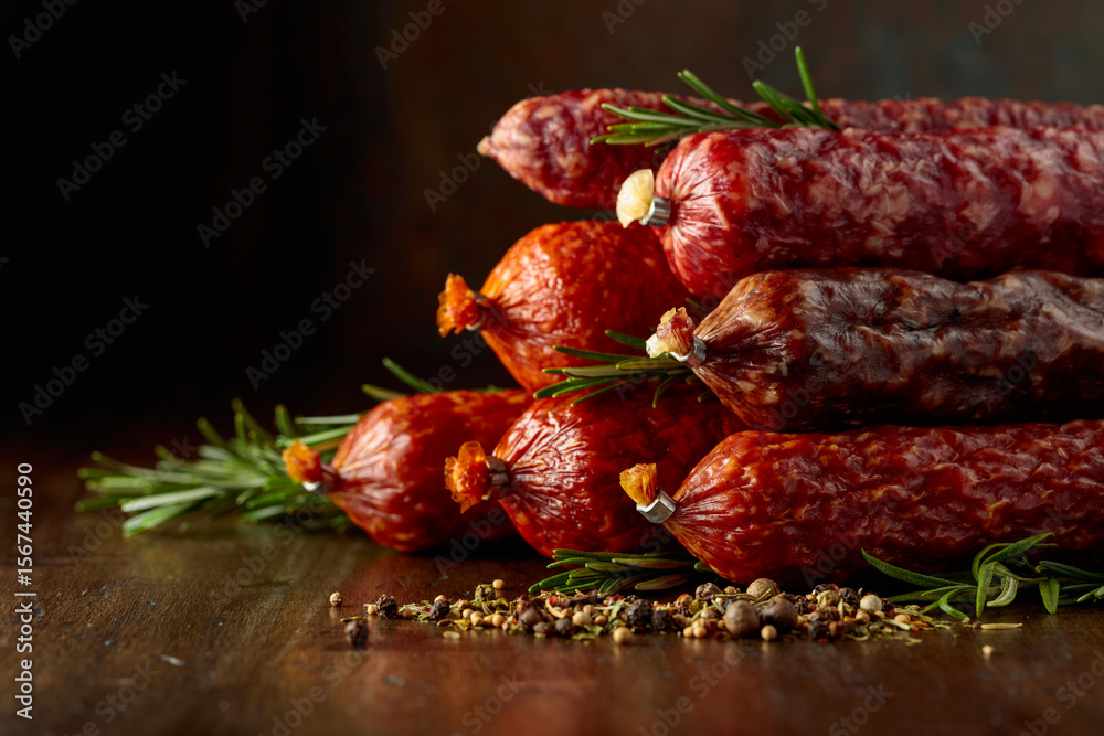 Smoked and dry cured sausages on a old wooden table.