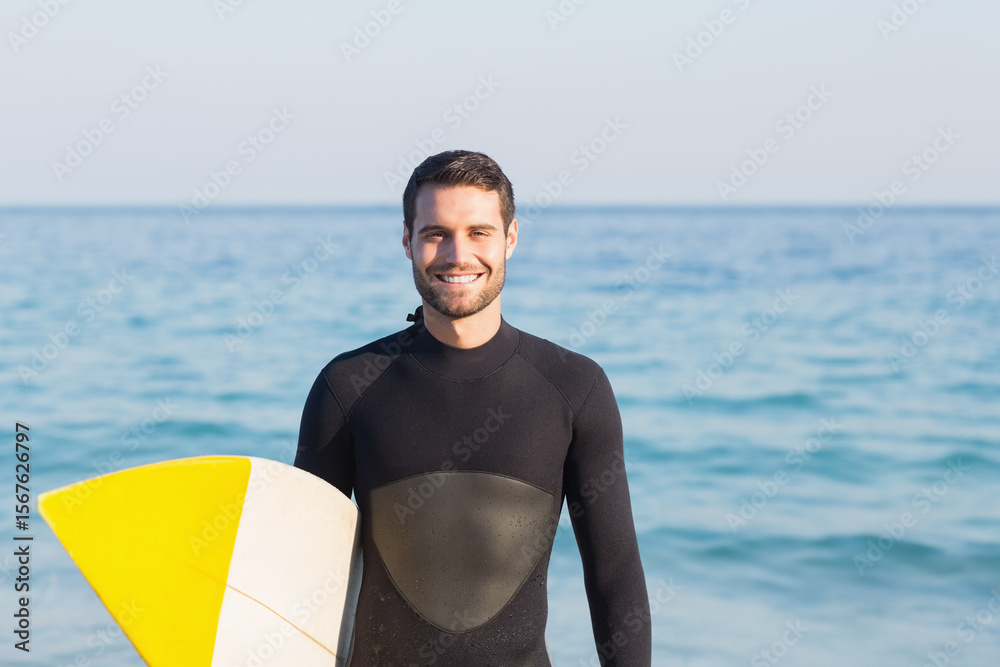 Man wearing black wetsuit standing on sandy beach holding yellow-white surfboard by ocean