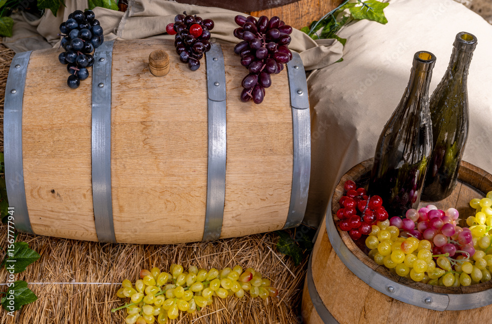Wooden wine barrel with grapes and bottles on the street.