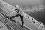 Senior sportsman stretching his leg on riverbank.