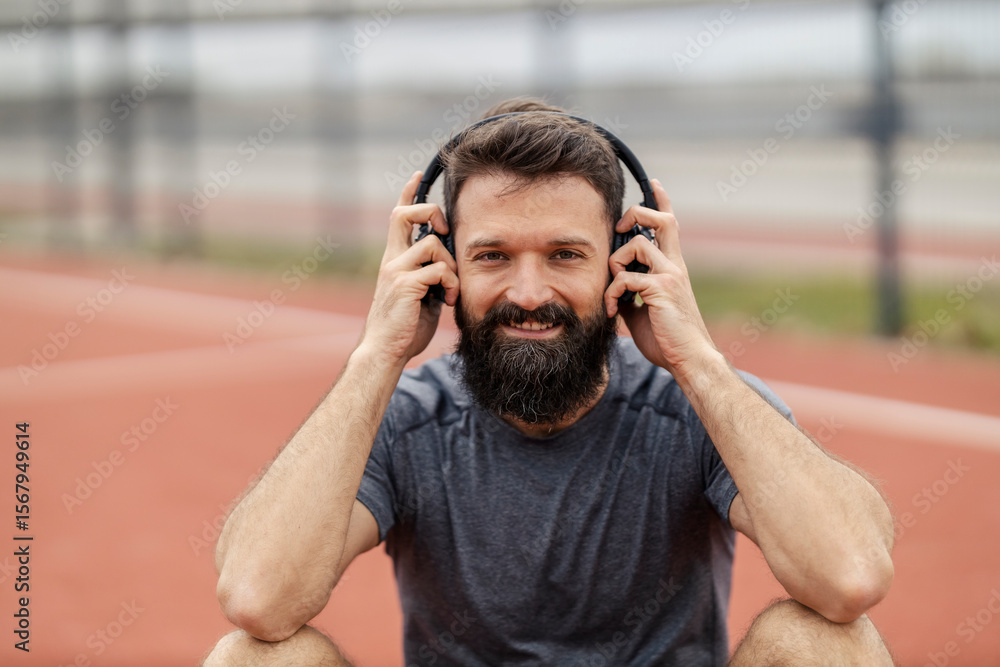 Portrait of smiling sportsman putting on headphones and enjoying music on court during a break.