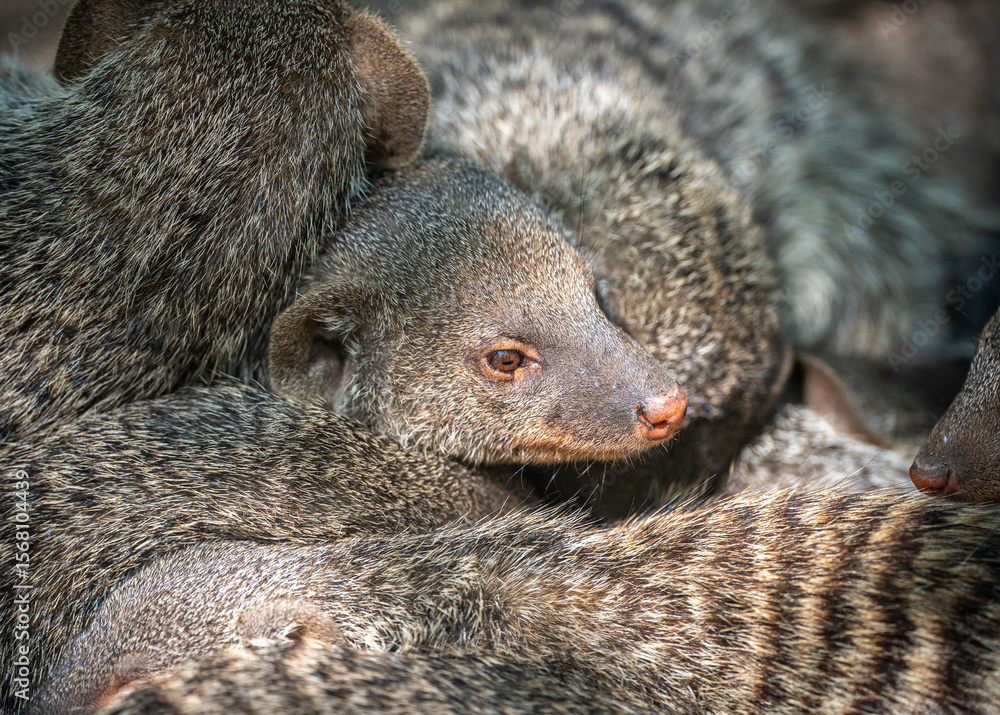 A group of Banded Mongoose - Mungos mungo - being caring an playful on a lawn in Czech Republic