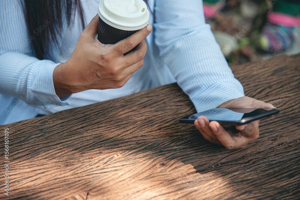 Close up women hands holding coffee cup smartphone E-commerce online Shopping website Reading Article Blog vlog. Young Woman hands holding mobile phone drinking Coffee Cup technology lifestyle