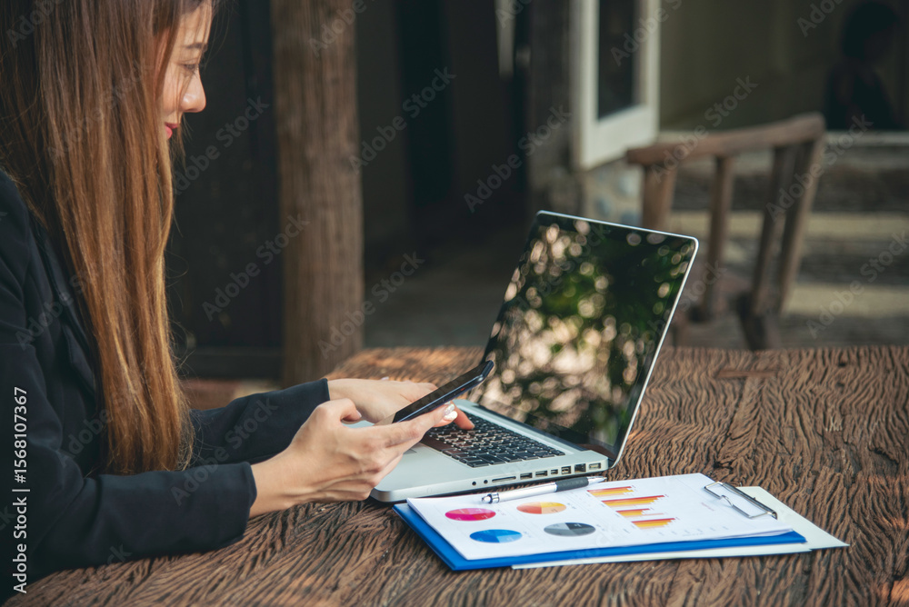 Happiness Asian Woman working from home using laptop online meeting in home office. Happy relax time asian business woman typing keyboard use notebook laptop Smiling, laughing at home office.
