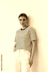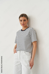 Stylish female model posing indoors in casual striped top and white pants