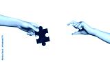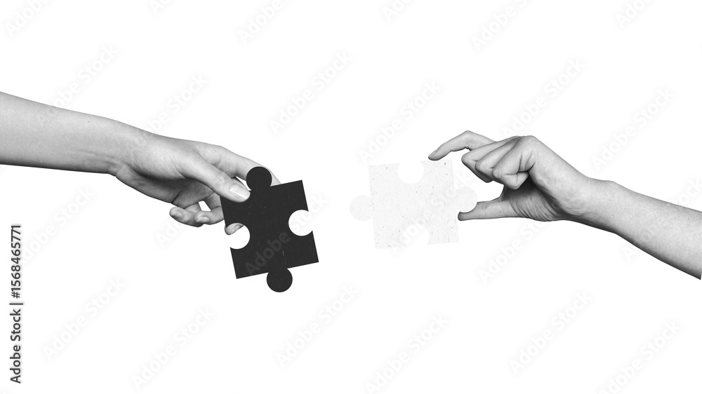 Modern collage two hands connect puzzle pieces. Teamwork concept, business idea, brainstorming. Creative solution. Merger of organizations. Partnership.