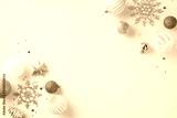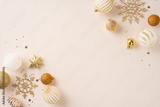 Golden decor elements such as baubles, stars, and snowflakes on a soft beige surface decorated with sparkles creating an elegant holiday ambiance