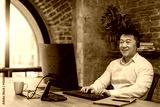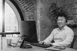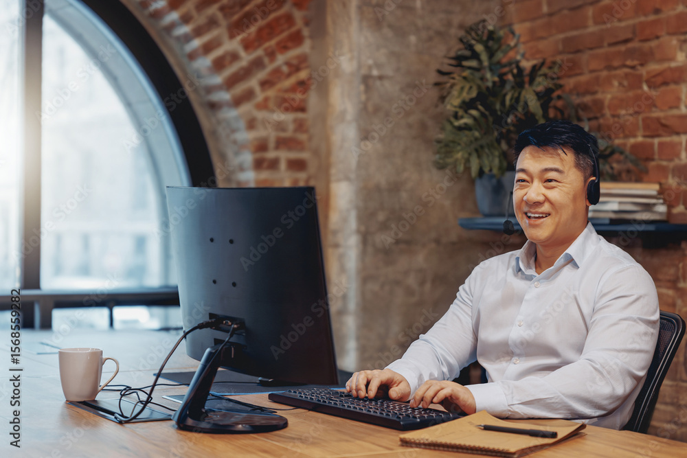 A man in a comfortable headset works in a stylish office with exposed brick walls and a modern computer