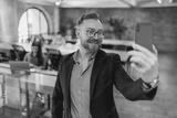 A man dressed in a stylish blazer joyfully capturing a selfie in a contemporary and chic office setting