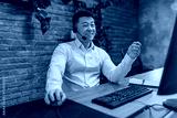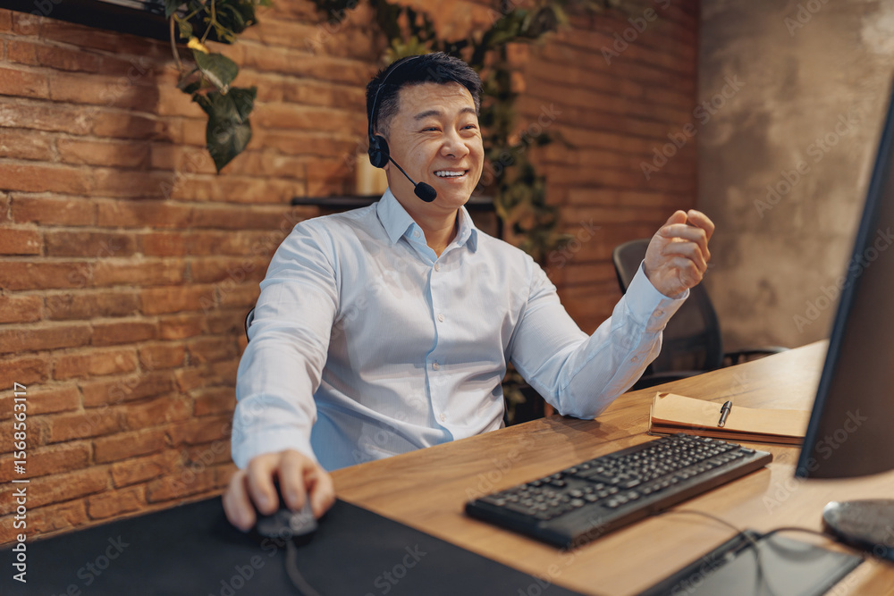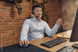 A man wearing a headset is communicating enthusiastically and effectively in a modern contemporary workspace