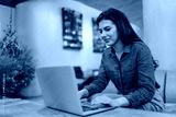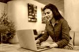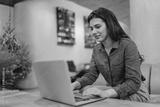 A young woman intently works on her laptop, generating ideas in a stylish and productive environment