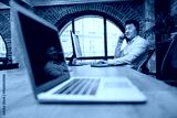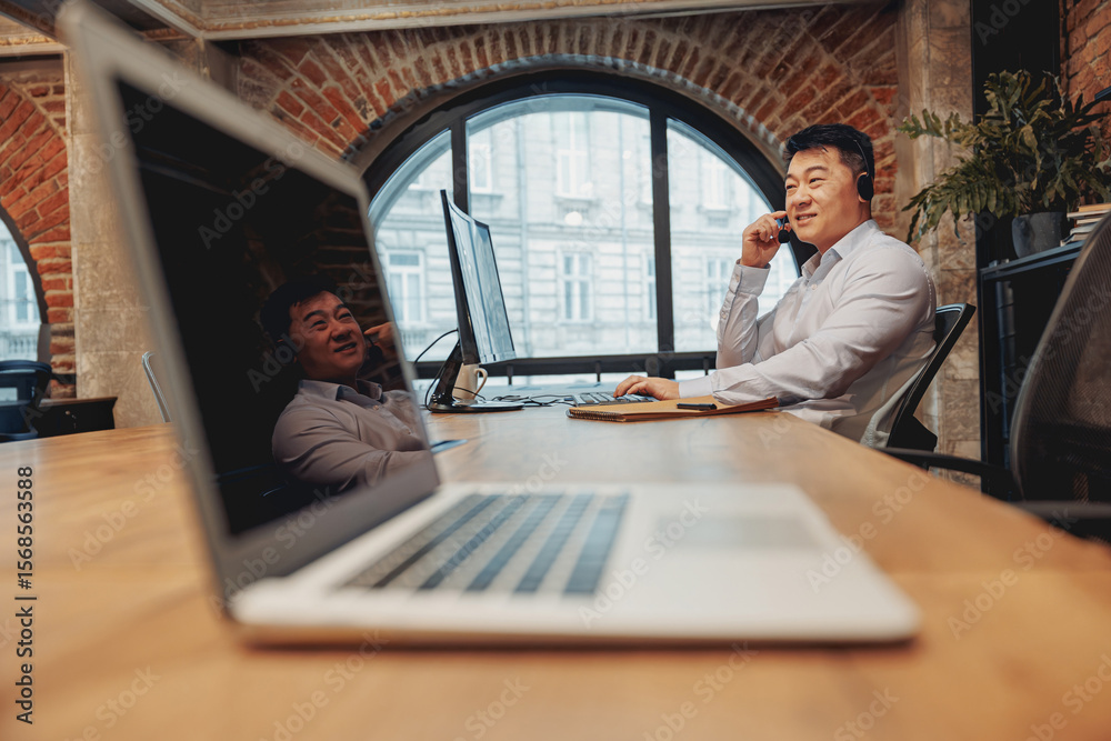 A dedicated professional is engaged in a phone call while working in a stylish, contemporary office