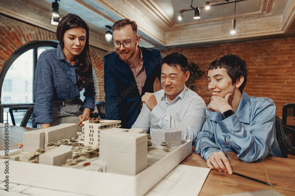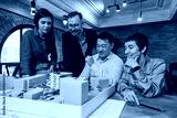 A diverse group of professionals collaborating on an architectural model, showcasing teamwork and creativity.