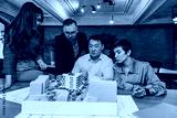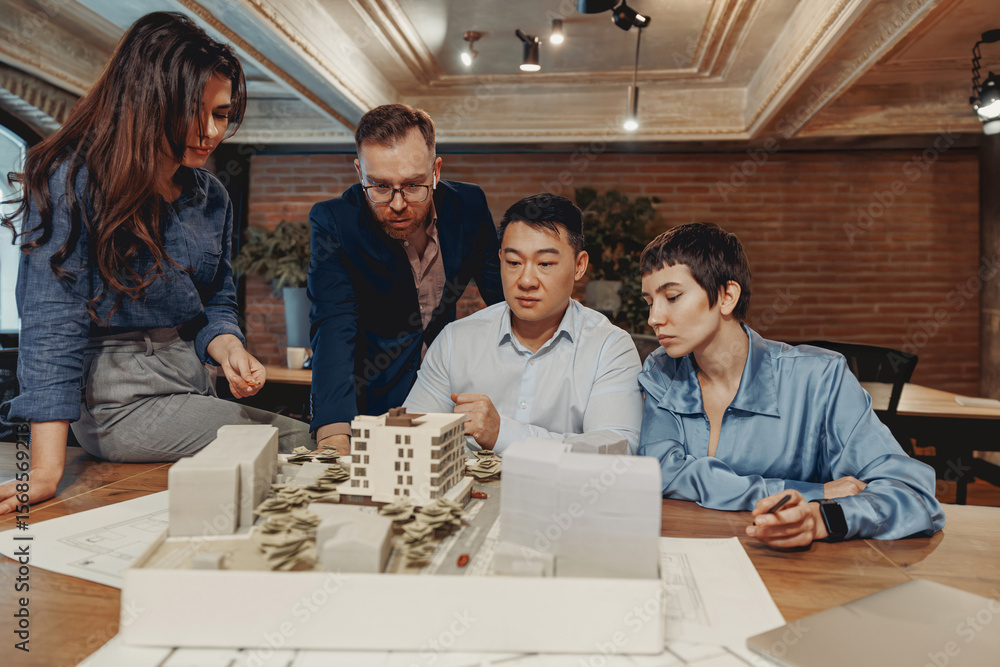 In a modern office environment, professionals are collaborating over a detailed architectural model together