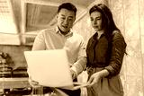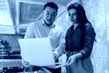 Two professionals engage in a thoughtful discussion while sharing ideas over a laptop in a stylish office