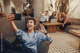 A joyful group of friends is excitedly taking a fun selfie in a stylish and contemporary workspace setting