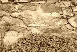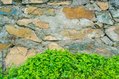 Old stone wall with leaves .